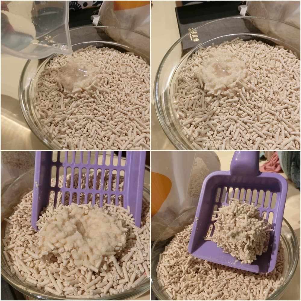 隨著水的倒入,豆腐砂會略為膨脹並且凝結成團