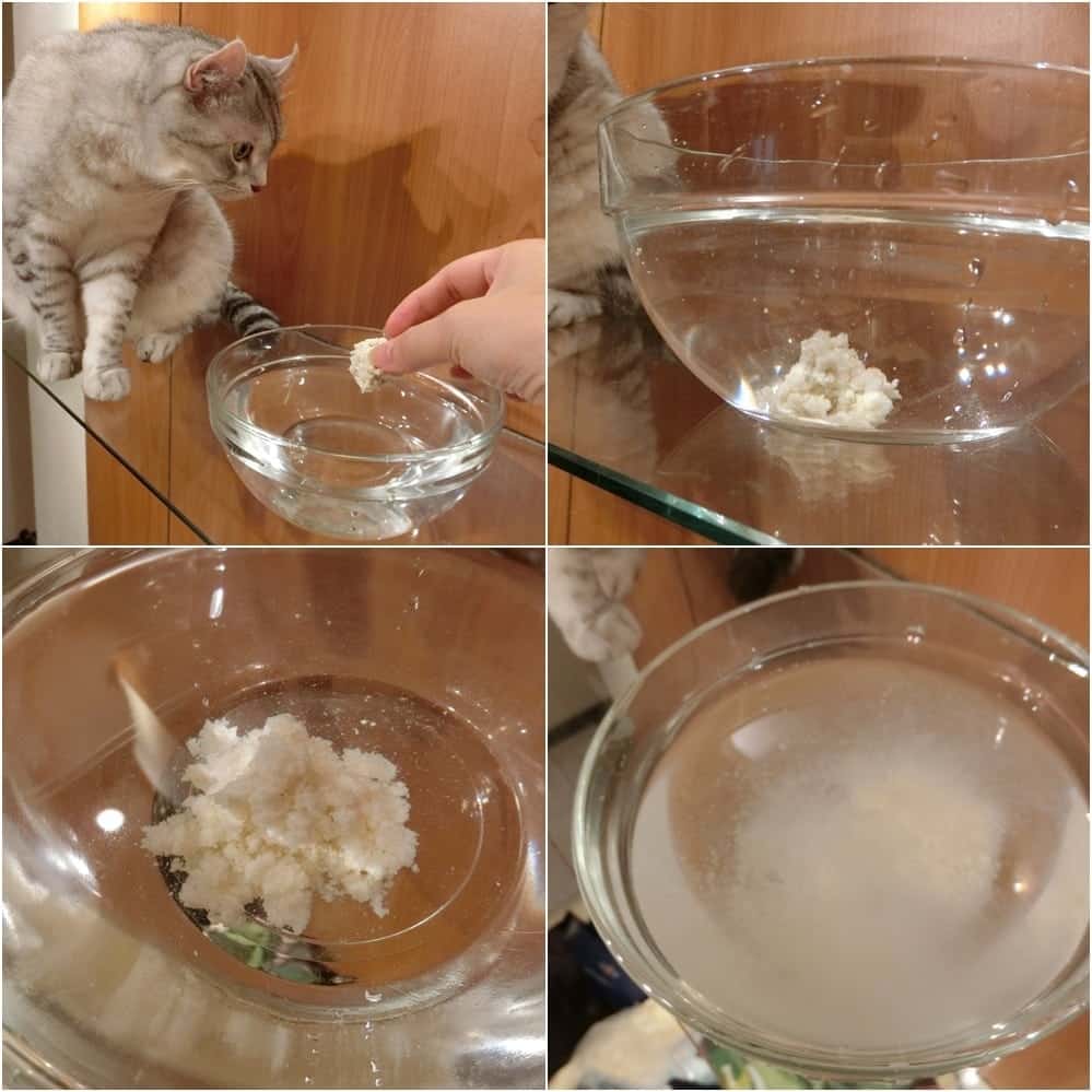 接著把成團的豆腐砂丟入水中測試溶解力
