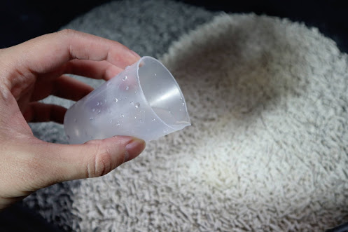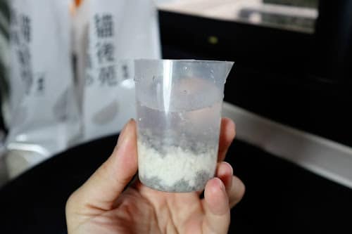 倒一點水在活性碳及原味貓砂試試凝結力。