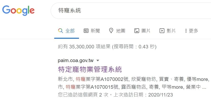 搜尋到的第一個項目就是我們要找的 ”特定寵物業管理系統”,在這個網站裡你可以搜尋到跟寵物相關店家的詳細資料